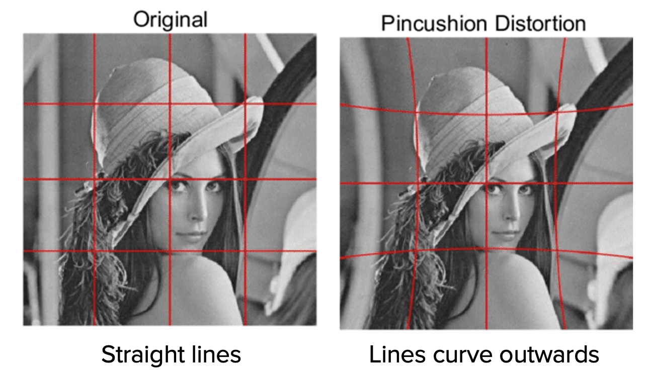 - Pincushion distortion is a geometric, nonlinear magnification across the image