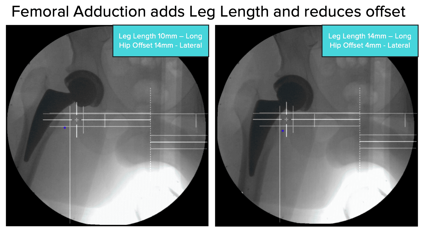 - Check Leg Abduction/Adduction - the live image should replicate the reference image. Femoral Abduction adds leg length but reduces offset.